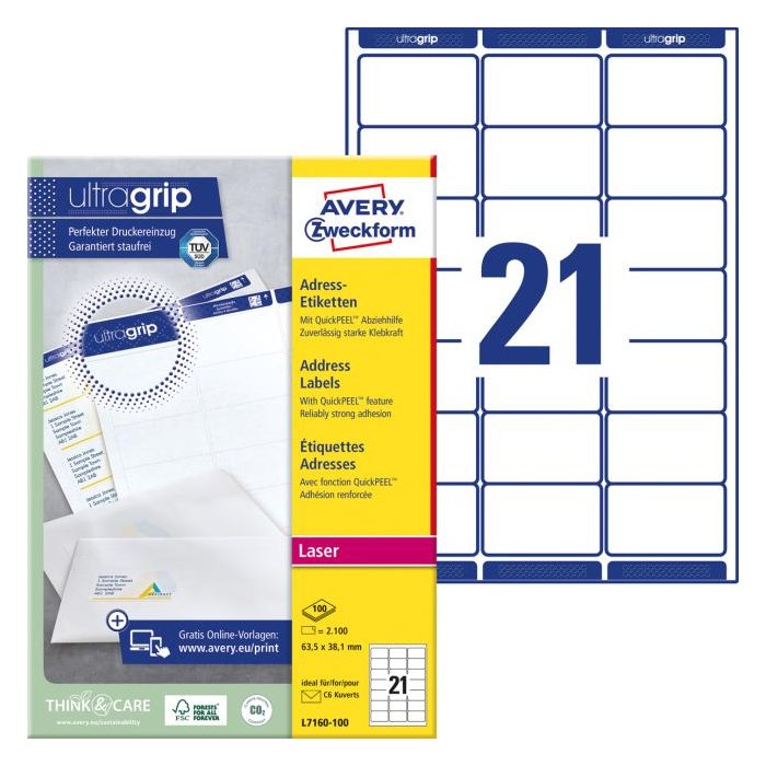 -Biele adresné etikety Avery Zweckform s certifikáciou FSC® Vám ušetria čas aj peniaze. -Vďaka inovatívnej technológii UltraGrip sa môžete spoľahnúť na bezchybné natiahnutie archu etikiet a na tlač bez zasekávania archu etikiet v tlačiarni. -Bezpečnostný okraj QCT zabraňuje vytekaniu lepidla do tlačiarní. -Bezproblémový priechod etikiet laserovými tlačiarňami bol dokonca testovaný a potvrdený certifikáciou TÜV SÜD. -Vďaka QuickPEEL ™ technológii odlepíte etiketu od podkladového papiera počas sekundy a aplikácia je tak veľmi rýchla. -Navrhnite a vytlačte si svoje štítky ľahko a rýchlo pomocou bezplatných šablón v online softvéri Design & Print od Avery Zweckform na adrese www.avery-zweckform.cz/software/avery-design-print alebo použite základné šablóny integrované v balíku Microsoft® Office. -Etikety vhodné pre všetky štandardné laserové tlačiarne.