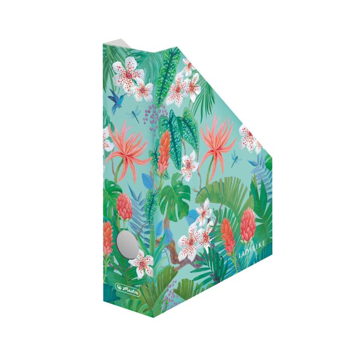 Archív na časopisy produktového radu Ladylike z vlnitej lepenky. Šírka chrbta 7,5 cm, otvor na chrbtovej strane. Rozmery 30,7 × 22,5 × 75 mm. Väčšie balenie 50 ks. Motív Jungle.