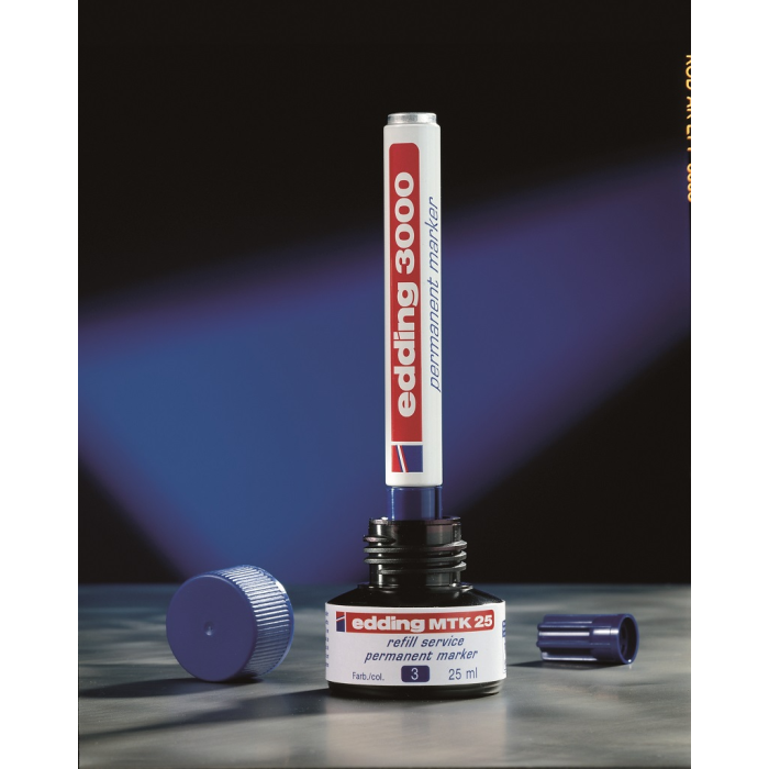 Atrament slabého zápachu s kapilárnym systémom na dopĺňanie permanentných popisovačov edding 2000/-2000 C, 2200/-2200 C, 400, 300, 330 a 370. Obsah 25 ml. Tento chemický prípravok je nebezpečný. Pri dopĺňaní vložte prednú časť popisovača špičkou do fľaštičky a po niekoľkých minútach bude popisovač pripravený k opätovnému použitiu. Obsah 25 ml.