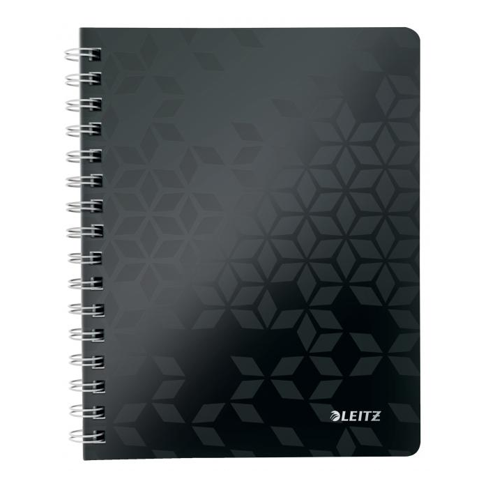 Krúžkový blok z dizajnovej rady Leitz WOW formátu A5 v žiarivých farbách. Vo vnútri biely papier s hmotnosťou 80 g / m2 s FSC® certifikáciou. Stránky sú perforované pre ľahšie odtrhávanie jednotlivých listov. Dvojitá drôtená krúžková väzba uľahčuje pretáčanie listov a zaisťuje dlhú životnosť bloku. Blok s pružnými doskami z polypropylénu obsahuje odnímateľné pravítko a vnútorné vrecko na uloženie voľných papierov, Väčšie balenie 6 ks. Farba čierna.