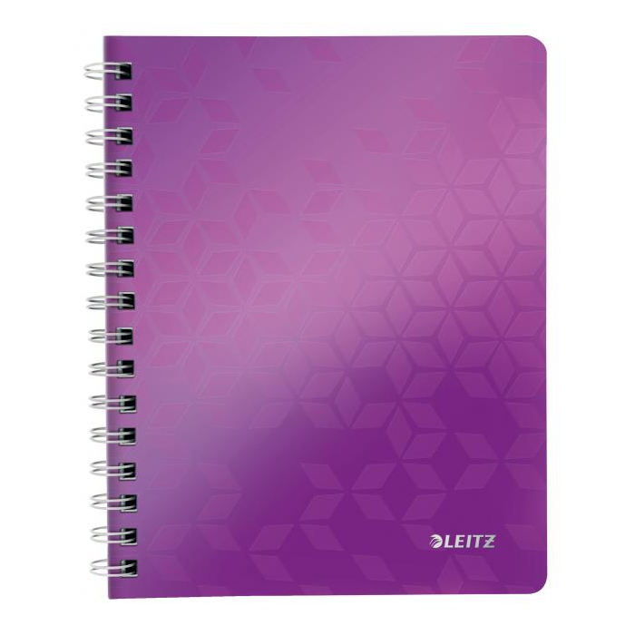Krúžkový blok z dizajnovej rady Leitz WOW formátu A5 v žiarivých farbách. Vo vnútri biely papier s hmotnosťou 80 g / m2 s FSC® certifikáciou. Stránky sú perforované pre ľahšie odtrhávanie jednotlivých listov. Dvojitá drôtená krúžková väzba uľahčuje pretáčanie listov a zaisťuje dlhú životnosť bloku. Blok s pružnými doskami z polypropylénu obsahuje odnímateľné pravítko a vnútorné vrecko na uloženie voľných papierov, Väčšie balenie 6 ks. Farba purpurová.