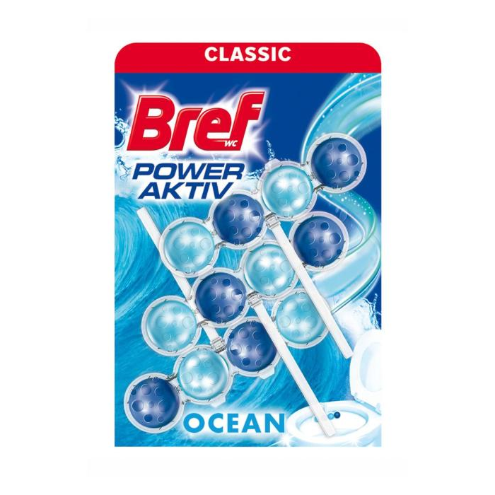 Tuhý WC blok Bref je vo forme 4 guľôčok s receptúrou so 4 funkciami - dokonalá čistota, čistiaca pena, ochrana proti vodnému kameňu a sviežosť. S atypickým tvarom, ktorý sa hodí pre všetky toalety. Certifikovaný ako odolný voči náhodnému otvoreniu deťmi (zdroj Nem. Inštitút pre Normalizáciu - norma DIN EN 862 2006). Vôňa oceánu.