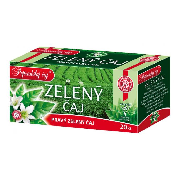 Pravý zelený čaj. Balenie 20 × 1,5 g. Vhodný doplnok pitného režimu.