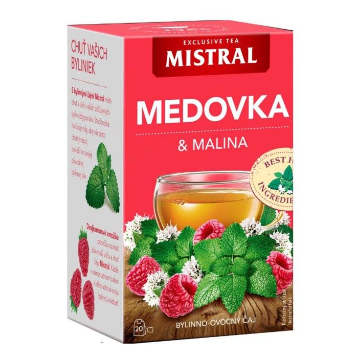 Aromatizovaný bylinno-ovocný čaj Medovka, mäta s príchuťou maliny.