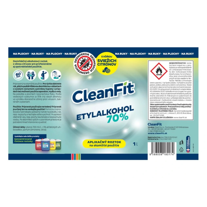 CleanFit dezinfekčný roztok Etylakohol 70% citrus 1 l + rozprašovač ZDARMA
