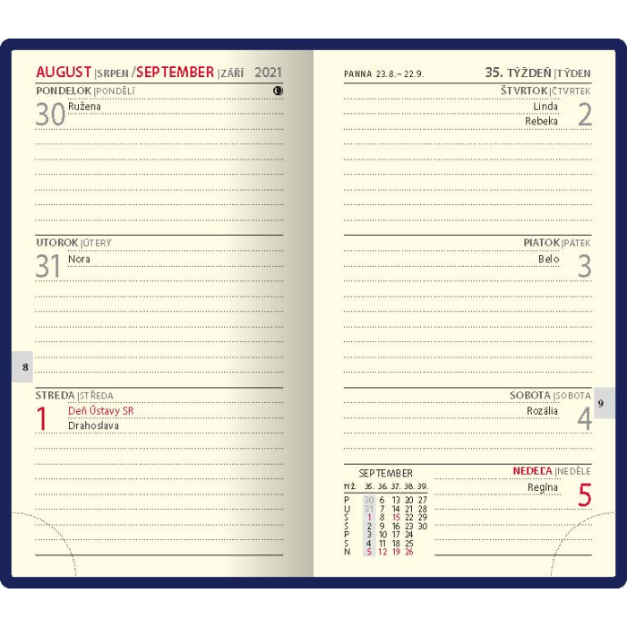 Obľúbený denný diár s prehľadným kalendáriom na každý deň. Diár je v pevnej väzbe s prednou penovou doskou, jednoduchý dizajn dopĺňa strieborná razba roku. Obsahuje slovenské kalendárium.
