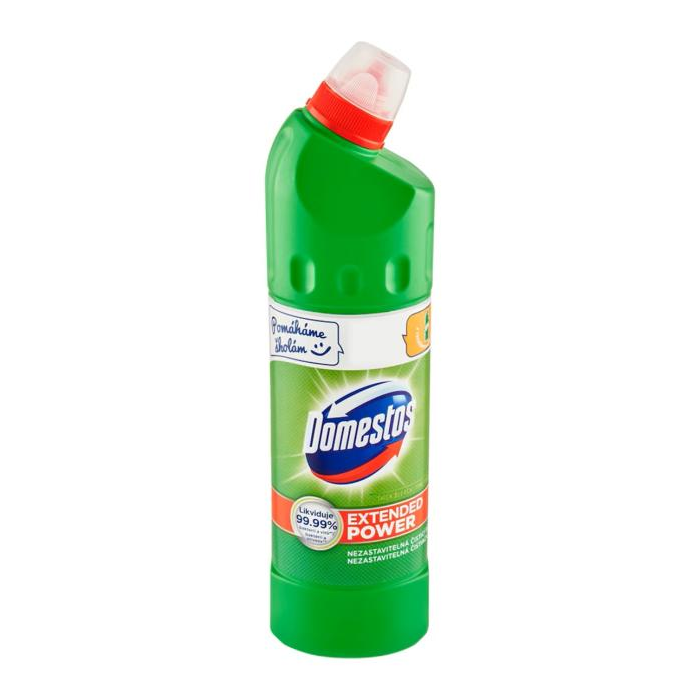Hustý gel a úsporné dávkovanie odstraňuje mastnotu, zažranú špinu a škvrny. Ničí všetky baktérie.Domestos Extended Power je nová generácia dezinfekčného prípravku, teraz s obsahom aktívnych molekúl, ktoré chránia toaletu pred vodným kameňom. Priľne k povrchu aj pod vodnou hladinou a odstraňuje škvrny a bráni hromadeniu vodného kameňa v toalete. Objem 750 ml.