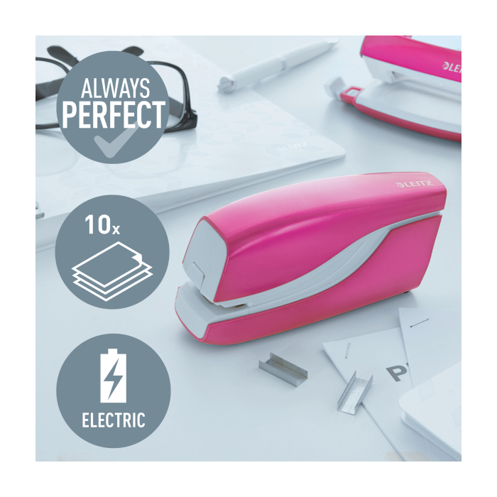 Elektrická zošívačka Leitz New NeXXt WOW. Vďaka jednoduchému ovládaniu jednou rukou je ideálna na časté používanie. Technológia s napájaním na batérie na zošívanie v pohybe. V žiarivých farbách WOW. Batérie (4× 1,5 V AAA LR03) nie sú súčasťou balenia. Kapacita 10 listov. Náhradné spinky ES556800. Farba ružová.