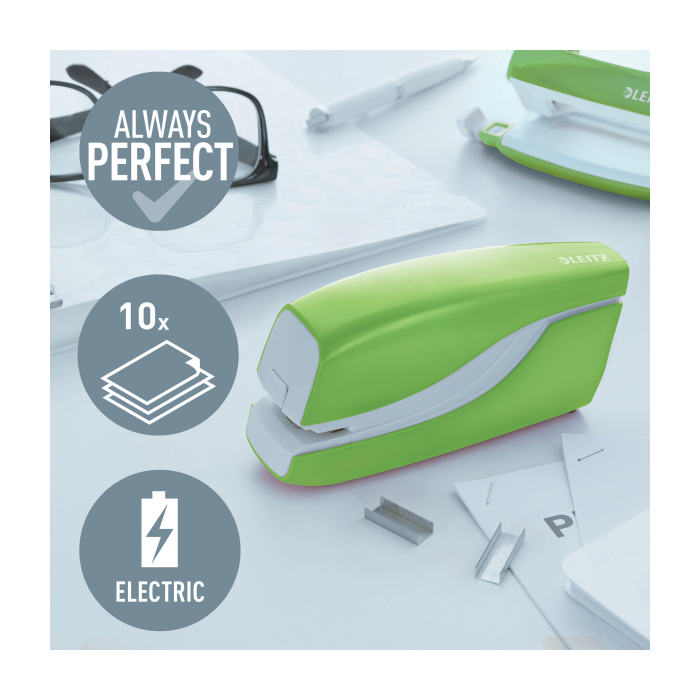 Elektrická zošívačka Leitz New NeXXt WOW. Vďaka jednoduchému ovládaniu jednou rukou je ideálna na časté používanie.