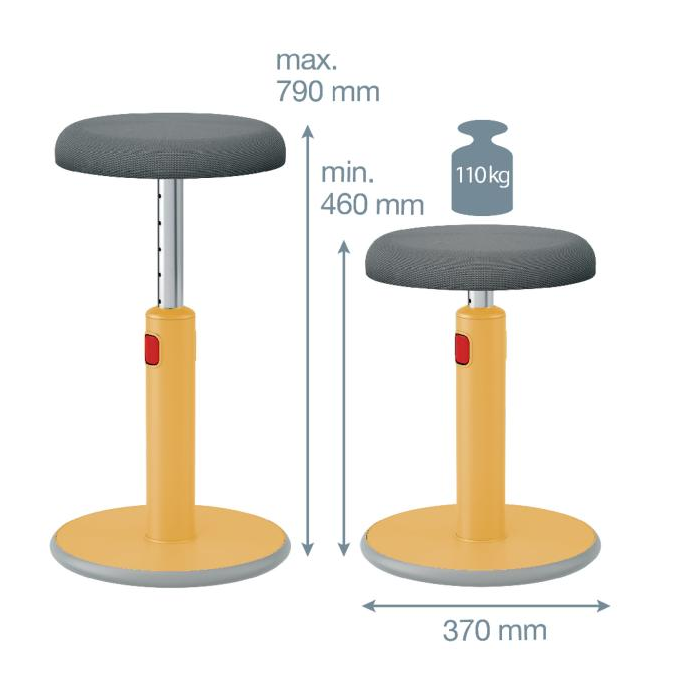 Ergonomická stolička Leitz Ergo umožňuje flexibilný pohyb medzi sedením a státím pri práci, podporuje pohyb svalov, zlepšuje držanie tela a zvyšuje hladinu energie. Má zaoblenú základňu, ktorá podporuje aktívny pohyb otáčaním a hojdaním. Pri práci zároveň posilňujete chrbtové svaly. Výšku možno ľahko nastaviť v rozmedzí 46-79 cm, stolička zostáva pevná a stabilná v akejkoľvek výške. Stolička je pohodlná a praktická, má sedadlo z priedušnej 3D peny potiahnuté vzdušnou sieťovinou protišmykovú základňu, ktorá nepoškodí podlahu. Maximálna nosnosť: 110 kg. Farba žltá.