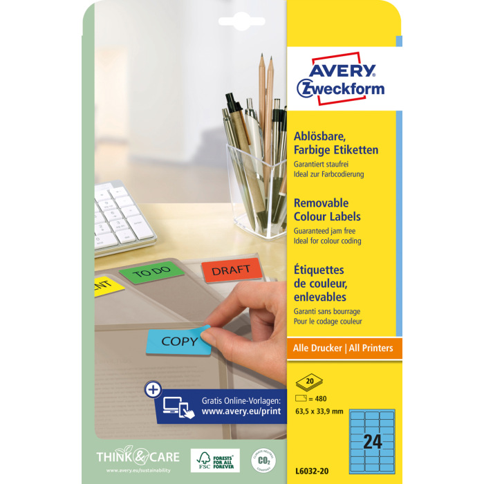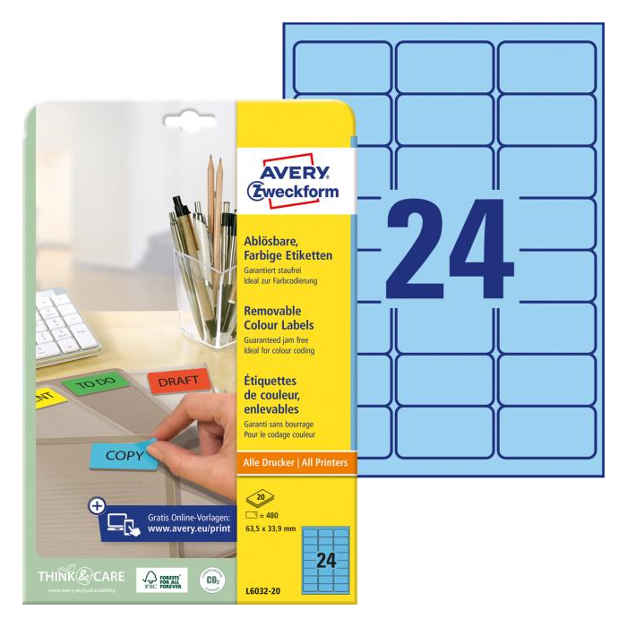 Odnímateľné samolepiace etikety STICK & LIFT odlepiteľné a znovu prelepiteľné (na bežnom povrchu až 5×) bez toho, aby zanechali stopy lepidla. Sú vhodné pre všetky druhy tlačiarní a kopíriek. Využiteľné najmä na každodenné pracovné činnosti, ako napr. vytváranie popisov, cenoviek, označovanie výrobkov, majetku a pod. Farba modrá. Etikety na hárku 24 ks. Balenie 20 hárkov. Rozmery 63,5 x 33,9 mm.