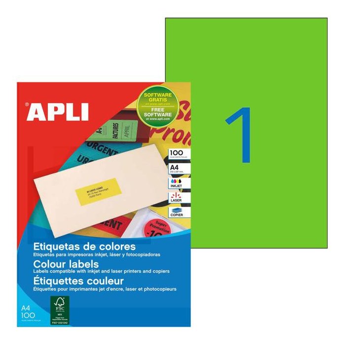 Etikety farebné 210x297mm APLI A4 100 hárkov fluo zelené