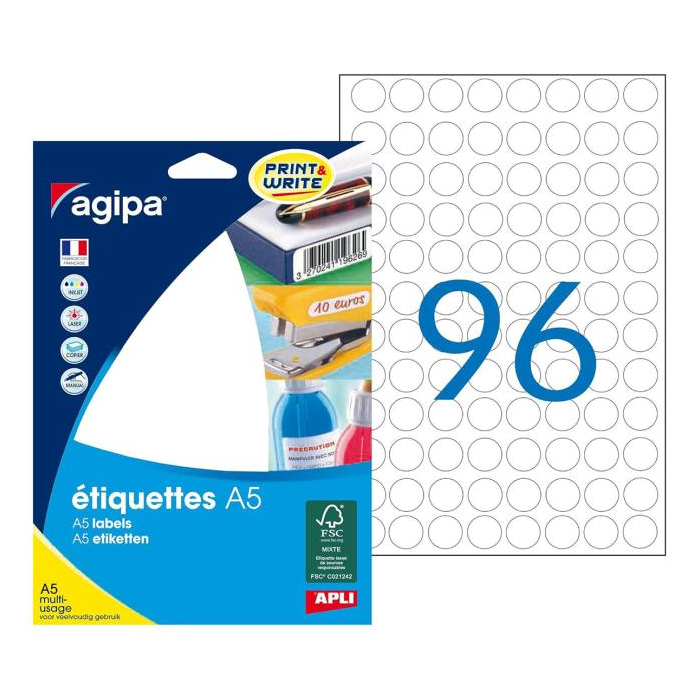 Biele kruhové etikety na formáte A5, na viacúčelovú tlač a ručný popis.