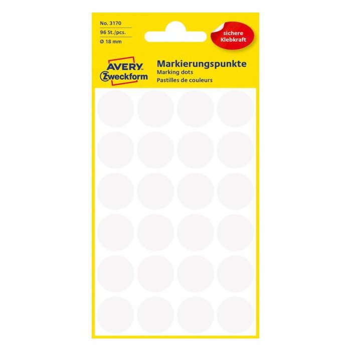 Kruhové etikety na ručný popis. Priemer 18 mm, v balení 96 etikiet. Farba biela.
