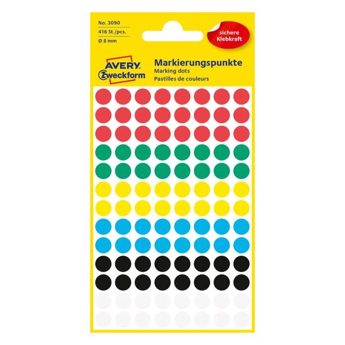 Kruhové etikety na ručný popis. Priemer 8 mm. Farba mix. Etikety v balení : 416 kusov.