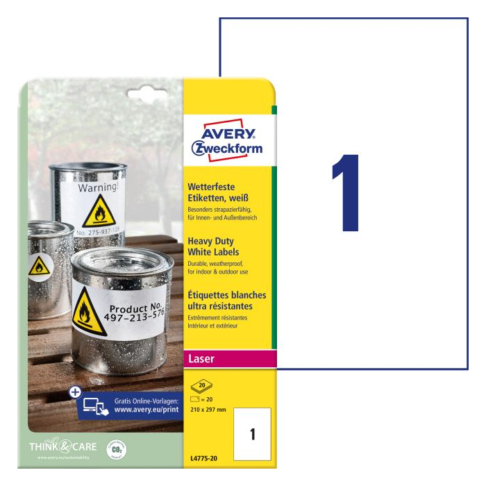Rozmery v mm : 210 × 297. Farba biela. Etikety na hárku 1 kus. Balenie 20 hárkov.