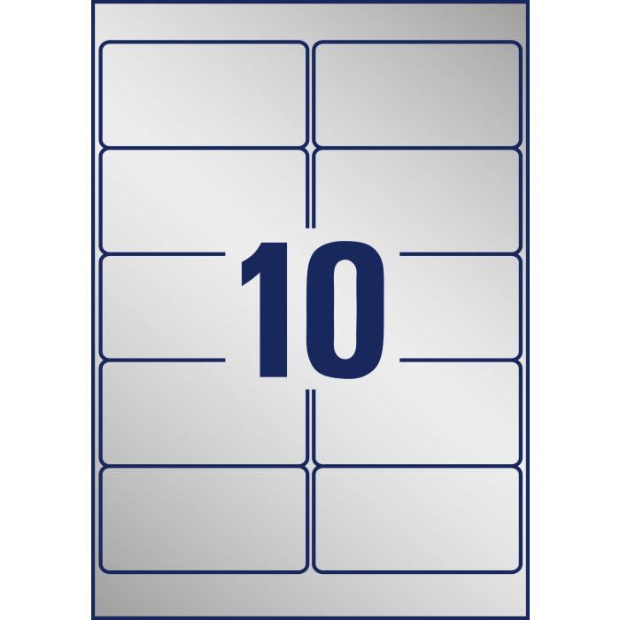 Veľmi odolné polyesterové etikety odolné voči oleju, prachu, špine, natrhnutiu, vode. Odolávajú teplotám od −40 ° do + 150 °C. Určené pre tlač v laserových tlačiarňach. Vhodné aj pre vonkajšie použitie. Rozmery v mm : 96 × 50,8. Farba strieborná. Etikety na hárku 10 kusov. Balenie 20 hárkov.