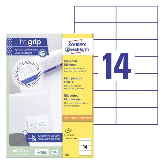Biele univerzálne etikety vhodné na každodenné použitie v atramentových a laserových tlačiarňach a kopírovacích strojoch. Vďaka inovatívnej technológie ultragrip sa môžete spoľahnúť na bezchybné natiahnutie archu a tlač bez zasekávania. Bezpečnostný okraj QCT zabraňuje zanášaniu tlačiarne lepidlom. Pre laserové tlačiarne testované a certifi kované TÜV SÜD. Vysoká lepivosť na rôznych povrchoch. Ostrá tlač bez bez rozmazávania. Etikety sú vyrobené spôsobom šetrným k životnému prostrediu, majú certifi káciu FSC®, sú bielené bez použitia chlóru. Šablóny a softvér pre jednoduchú a rýchlu tlač etikiet k dispozícii zdarma. U niektorých rozmerov systém QuickPEEL™ na rýchlejšie odlepenie etikiet. Formát A4. Balenie 100 hárkov.