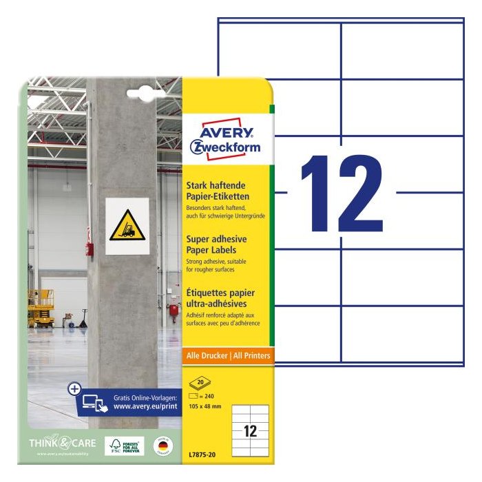 Silná priľnavosť, vysoká bezpečnosť. Zvlášť vhodné na označovanie a označovanie produktov a inventára a na vytváranie varovných a bezpečnostných upozornení v interiéri! Biele, extrémne priľnavé papierové etikety vo formáte 105 x 48 mm sú dvakrát pevnejšie ako bežné papierové etikety. Papierové štítky sa lepia aj na ťažké povrchy, ako sú nerovné, drsné, vlhké alebo zaprášené povrchy pri rôznych teplotách. Môžete sa spoľahnúť na zaručený chod tlačiarne bez zaseknutia bez akýchkoľvek usadenín lepidla v tlačiarni. Etikety je možné tlačiť na všetkých bežných laserových a atramentových tlačiarňach.