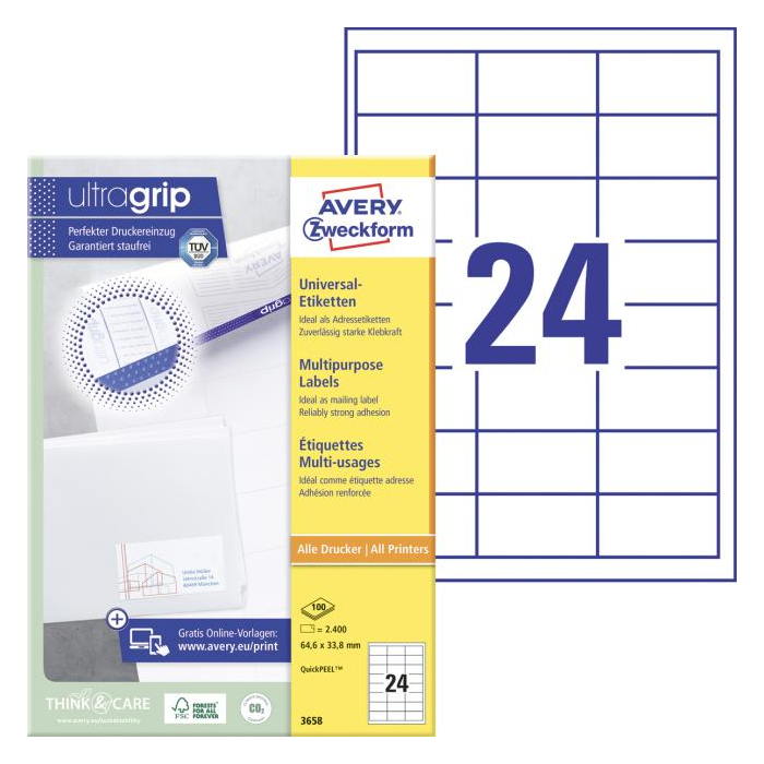 Etikety univerzálne 64,6x33,8mm Avery A4 100 hárkov