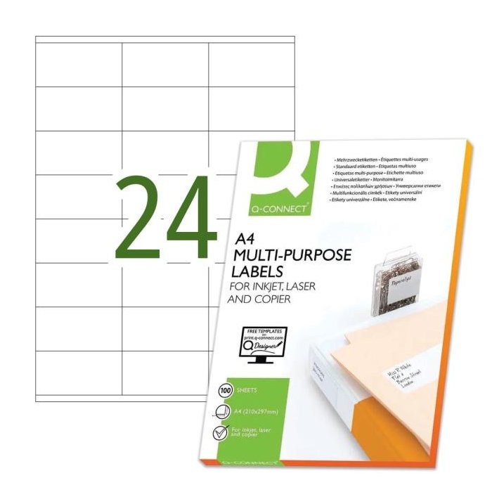 Univerzálne samolepiace etikety pre laserové a atramentové tlačiarne a kopírovacie zariadenia. Formát A4. Farba biela. Balenie 100 hárkov. Etikiet na hárku 24 ks.