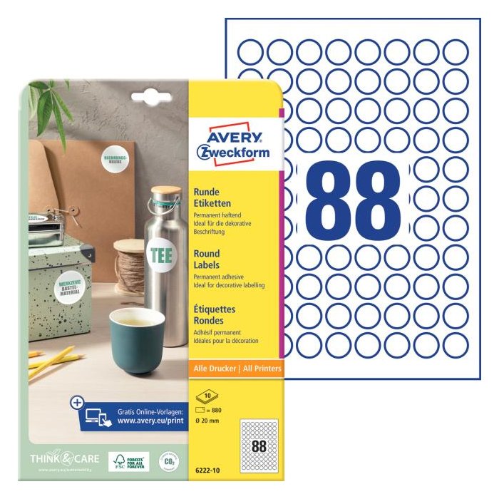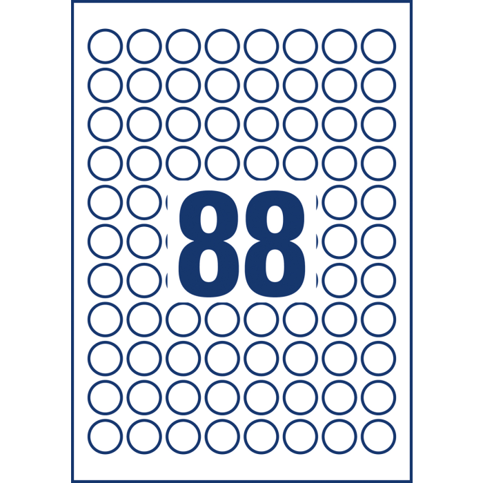 Biele kruhové univerzálne etikety vhodné na každodenné použitie v atramentových a laserových tlačiarňach a kopírovacích strojoch. Ostrá tlač bez bez rozmazávania. Etikety su vyrobené spôsobom šetrným k životnému prostrediu, majú certifikáciu FSCR, sú bielené bez použitia chlóru. Šablóny a softvér pre jednoduchú a rýchlu tlač etikiet k dispozícii zdarma. Formát A4. Balenie 10 hárkov. Priemer 20 mm.