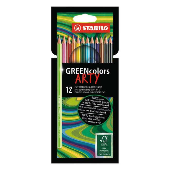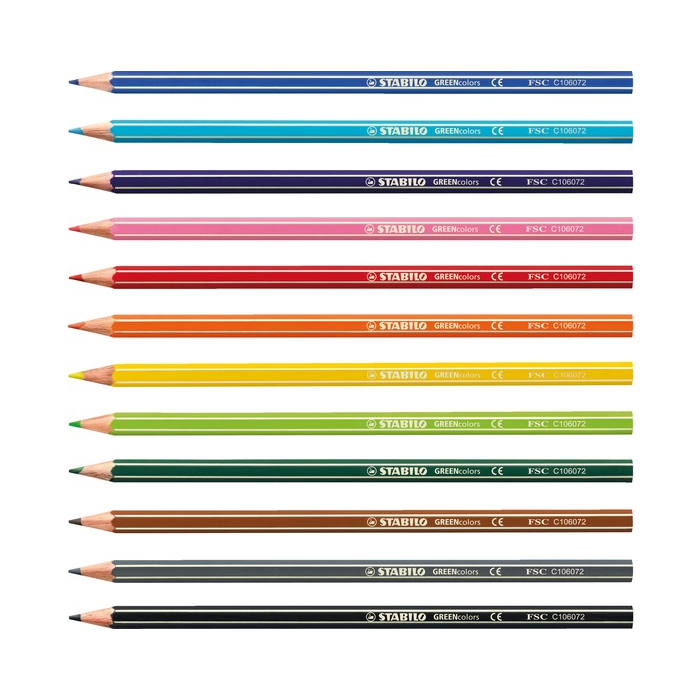 Farbičky STABILO GREENcolors sú vyrobené zo 100% certifikovaného dreva s certifikátom FSC® (Forest Stewardship Council) pochádzajúceho z udržateľných lesov. Kvalitné tuhy s priemerom 3 mm. Klasický šesťhranný tvar s matným lakovaním. Intenzívne žiarivé farby. Sada 12 ks.