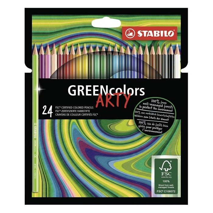 Farbičky STABILO GREENcolors sú vyrobené zo 100% certifikovaného dreva s certifikátom FSC® (Forest Stewardship Council) pochádzajúceho z udržateľných lesov. Kvalitné tuhy s priemerom 3 mm. Klasický šesťhranný tvar s matným lakovaním. Intenzívne žiarivé farby. Sada 24 ks.