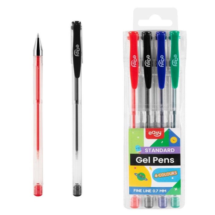 Sada 4 gélových pier EASY STANDARD v základných farbách modrá, čierna, červená a zelená, je ideálna ako do domácnosti, tak školy či kancelárie. Elegantný vzhľad Set gélových pier STANDARD je určený osobám, ktoré preferujú ľahký a moderný vzhľad. Gélová náplň je uschovaná v transparentnom tele s doplnkami v klasických, elegantných farbách, čo poskytuje veľmi zaujímavý vizuálny efekt. Klasické farby V ceruzkách sa nachádza špeciálna náplň s gélovou konzistenciou v klasických farbách: modrá, červená…