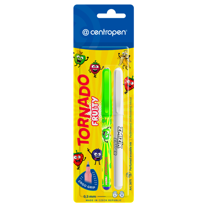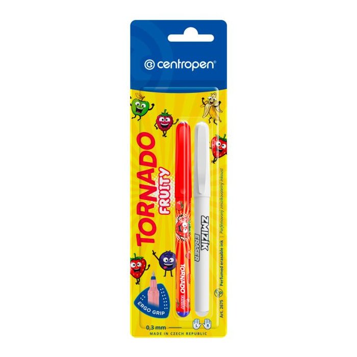 Obľúbené guľôčkové pero Tornado s trojuholníkovou úchopovou časťou s masážnymi bodmi, s tenkou rovnomernou stopou šírky 0.3 mm, ktorá sa dá vyzmizíkovať, atramentová náplň modrej farby. Telo pera je z kvalitného plastu, dodávané v 5 farebných kombináciách. Pero je určene pre pravákov, ľavákov i dysgrafikov.