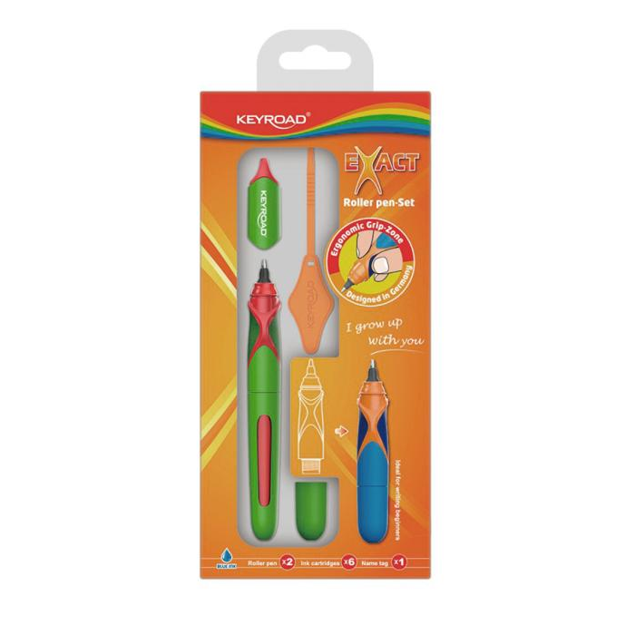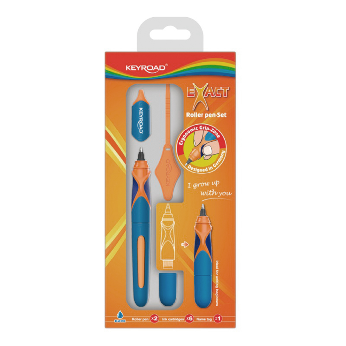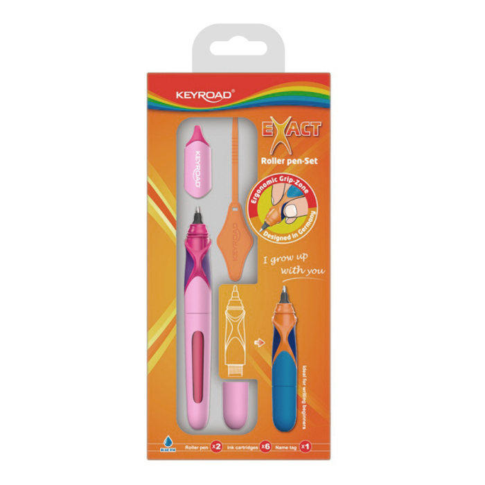 Guľôčkové pero, dve veľkosti puzdra: krátky pre najmladších, štandardný pre starších, s ergonomickou rukoväťou. V sade: 6 kaziet s modrým atramentom, menovka, farba: mix farieb.