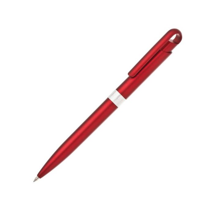 Plastové guľôčkové pero FIROL v metalických farbách. Uprostred pera je stieborný krúžok. Modrá náplň veľkoobjemová. Kolekcia DESIGN. Farba červená.