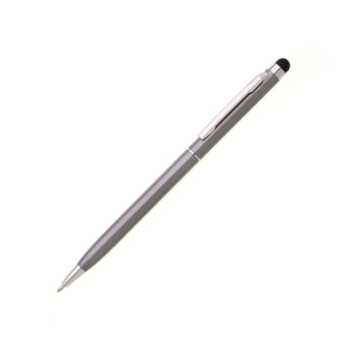 Tenké kovové guľôčkové pero s otočným mechanizmom a hrotom pre ovládanie dotykovej obrazovky. Strieborné chrómové doplnky, modrá náplň cross. Materiál hliník.