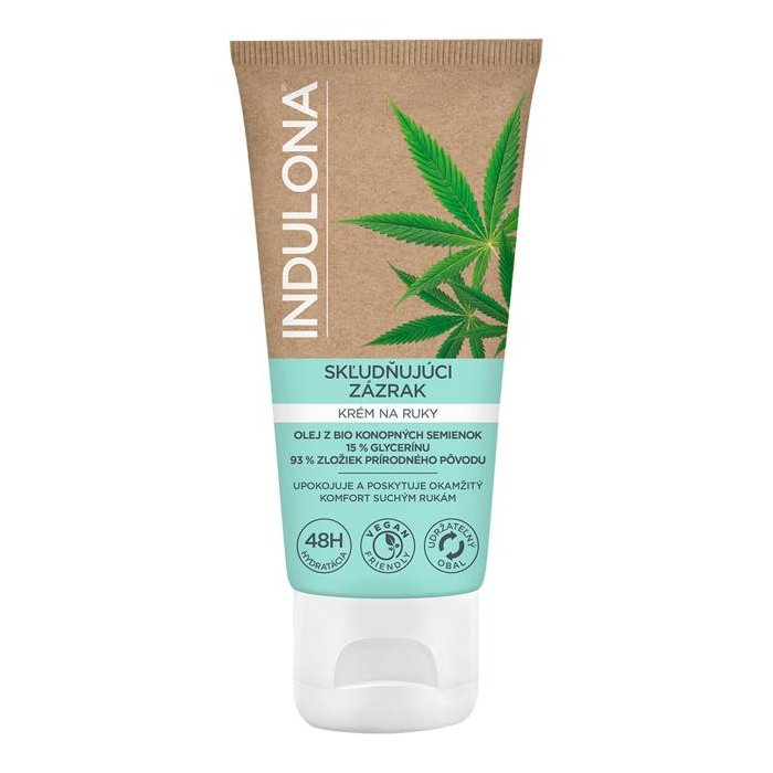 Obľúbené krémy na ruky Indulona teraz v novom šate! Krém na ruky Skľudňujúci zázrak od značky Indulona bol špeciálne vyvinutý tak, aby poskytol okamžitý komfort suchým rukám. Účinne hydratuje a upokojuje pokožku a poskytuje jej dlhotrvajúcu ochranu. Obsahuje organický konopný olej bohatý na vitamín E a omega mastné kyseliny, 15 % glycerínu a 93 % zložiek prírodného pôvodu. Doprajte si starostlivosť od Indulony!`