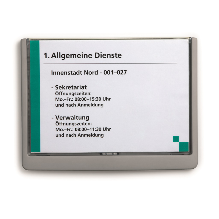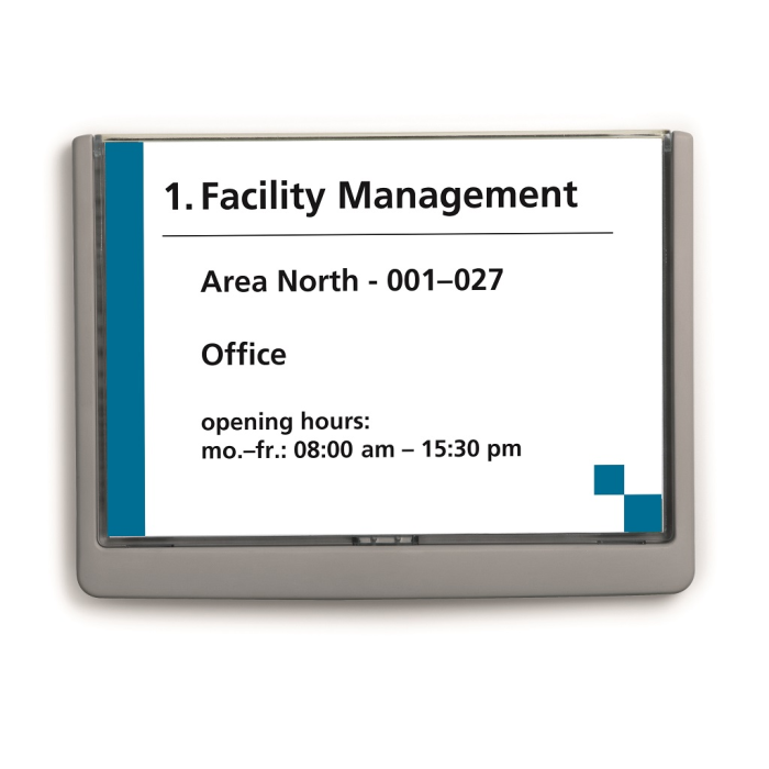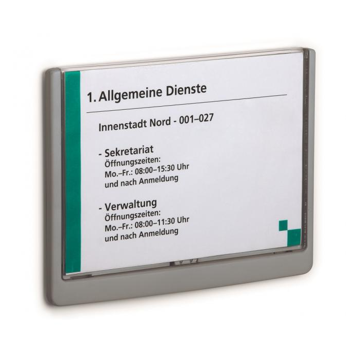 Moderná informačná tabuľka na dvere s lemom v atraktívnej grafitovej farbe. Predný panel sa otvára na jedno zatlačenie, a tým sa jednoducho sprístupnia vložené popisné papiere, ktoré sa môžu vymieňať podľa potrieb. Tabuľka je ideálna do kancelárií, úradov, škôl, univerzít a hotelov. Súčasťou balenia je montážna sada s názorným návodom. Namiesto pevného montovania môže byť tabuľka k povrchu aj prilepená.