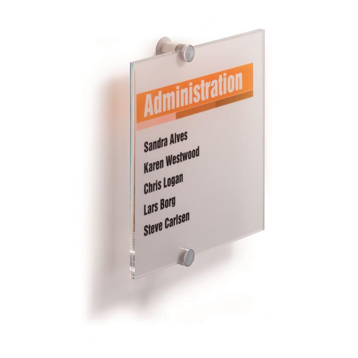 Tabuľka na dvere z novej rady v elegantnom, atraktívnom, a zároveň jednoduchom dizajne. Dodávaná s 2 polopriehľadnými vnútornými listami, vhodnými na farebnú alebo čiernu potlač. Listy sa vložia medzi akrylové panely tabuľky a tabuľka sa prichytí k stene alebo dverám 2 veľkými hliníkovými skrutkami. Ľahká montáž, názorný návod je priložený.