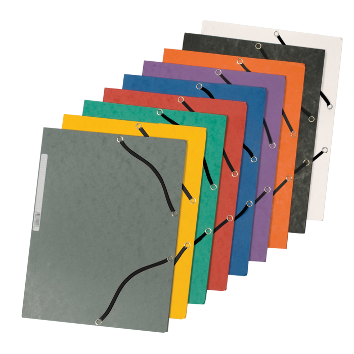 Obal s tromi chlopňami a gumičkou z kvalitného hladkého kartónu gramáže 375 g. Chrbtový štítok, kapacita 200 listov. Farba modrá.