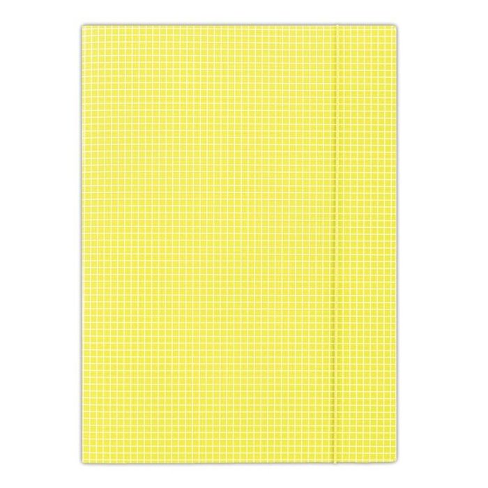 Kartonový obal vyrobený z lepenky s hmotnosťou 400g. Jednostranne potiahnutý vysoko lesklým tlačovým lakom, okrúhla vertikálna guma vo farbe obalu chráni obsah pred vykĺznutím. Károvaná potač. Formát: A4. Farba žltá. Rozmery 232 x 317 mm.