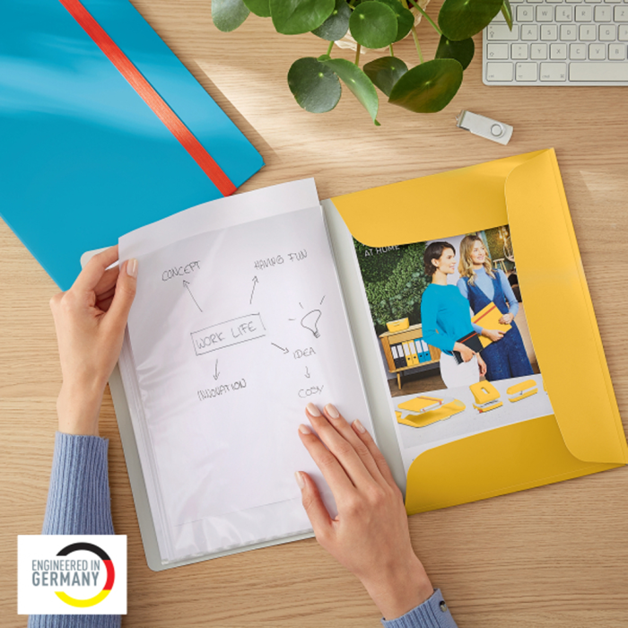 Katalógová kniha Leitz Cosy A4 je ideálna na prezentáciu alebo ukladanie dokumentov, dokumenty chráni a umožňuje ich jednoduché prezeranie. Praktické integrované 3-chlopňové dosky vzadu rozširujú celkovú kapacitu. 20 priehľadných plastových vreciek na prezentáciu 40 hárkov papiera A4 + (80 g/m2). Rozšírená kapacita vďaka integrovaným 3-chlopňovým doskám na zadnej strane knihy. Hrubá elastická gumička na bezpečný prenos dokumentov. Vyrobená z vysoko kvalitného ľahkého recyklovateľného PP pre dosiahnutie pevnosti a odolnosti. Farba žltá.