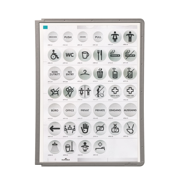 Displejový panel vyrobený z matného antireflexného polypropylénu pre systém Sherpa, kovové držiaky a rotačný stojan. Vložený materiál je kopírovateľný a skenovateľný. Pevný farebný rám s pozíciami pre indexy. Formát A4. Balenie 5 ks.