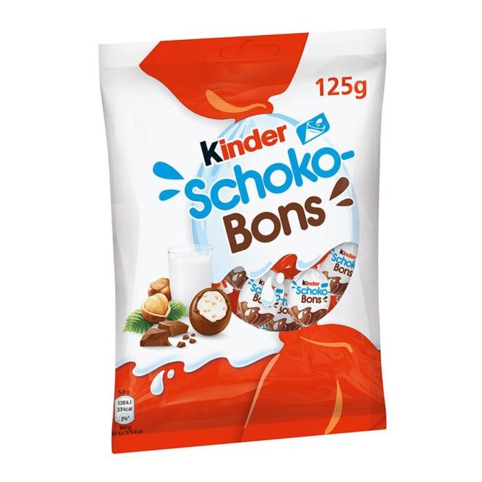 Mliečna čokoláda 50% (cukor, sušené plnotučné mlieko, kakaové maslo, kakaová hmota, emulgátor: lecitíny (sójové), aróma), Cukor, Sušené odtučnené mlieko, Palmový olej, Lieskovce (5,8 %), Maslový tuk, Čokoláda (cukor, kakaová hmota, kakaové maslo, emulgátor: lecitíny (sójové), aróma), Leštiace látky: (arabská guma, šelak), Glukózový sirup, Emulgátor: lecitíny (sójové), Arómy, Obsah mliečnej sušiny: najmenej 28 % z celkovej hmotnosti, Obsah kakaových zložiek: najmenej 16 % z celkovej hmotnosti.