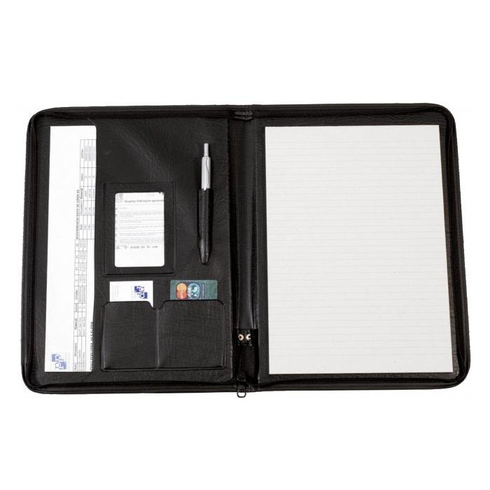 Konferenčná mapa so zipsom, vybavená vreckami niekoľkých veľkostí a linajkovým poznámkovým blokom, bez mechaniky. V prevedení imitácie kože, úprava matná. Šírka chrbta 20 mm.