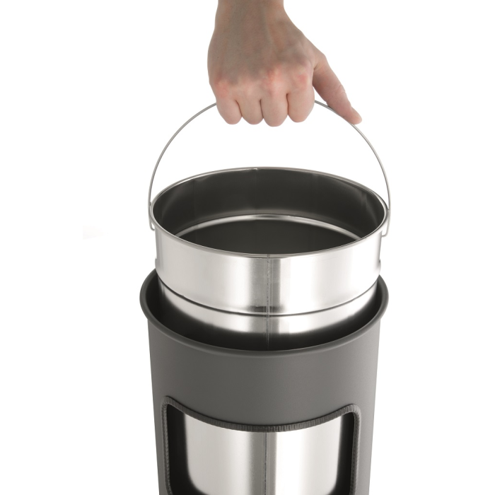 Kovový kôš na odpadky s vyberateľným zinkovým vnútrom a vyberateľným popolníkom naplneným pieskom /1,5 kg/ . Vhodný na použitie v interiéry aj v exteriéry. Objem koša 17 l, výška 620 mm, priemer 260 mm. Objem popolníka 2 l. Farba antracitová.