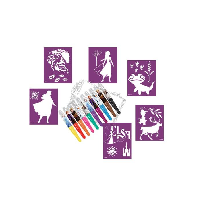 • Set obsahuje 10 fúkacích fixiek s potlačou, 6 papierových šablón s obrázkami a 24 listov na kreslenie, všetko v praktickej škatuľke.