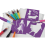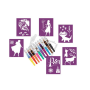 Set obsahuje 10 fúkacích fixiek s potlačou, 6 papierových šablón s obrázkami a 24 listov na kreslenie, všetko v praktickej škatuľke.