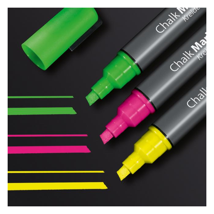 Ľahko stierateľné a vysoko nepriehľadné kriedové popisovače vhodné na sklenené tabule a všetky hladké povrchy podobné sklu. Zrezaný hrot hrúbky 1 - 5 mm. Vodeodolný atrament je zmazateľný vlhkou alebo suchou utierkou. Farba mix, žltá, ružová, zelená.