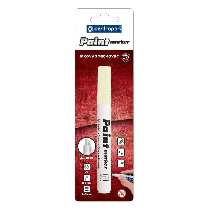 Lakový popisovač vhodný na neporézne povrchy. Svetlostály atrament po zaschnutí odolá vode, poveternostným vplyvom aj oderu. Hrot zrezaný, šírka stopy 1 - 5 mm. Väčšie balenie 10 ks v jednej farbe. Farba biela.