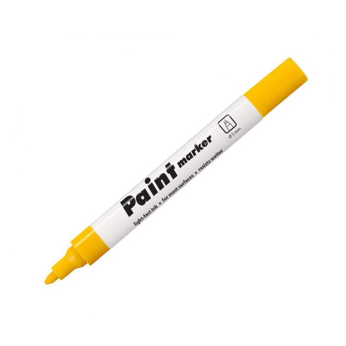 Lakový popisovač vhodný na neporézne povrchy. Svetlostály atrament po zaschnutí odolá vode, poveternostným vplyvom aj oderu. Hrot zrezaný, šírka stopy 1 - 5 mm. Väčšie balenie 10 ks v jednej farbe. Farba žltá.