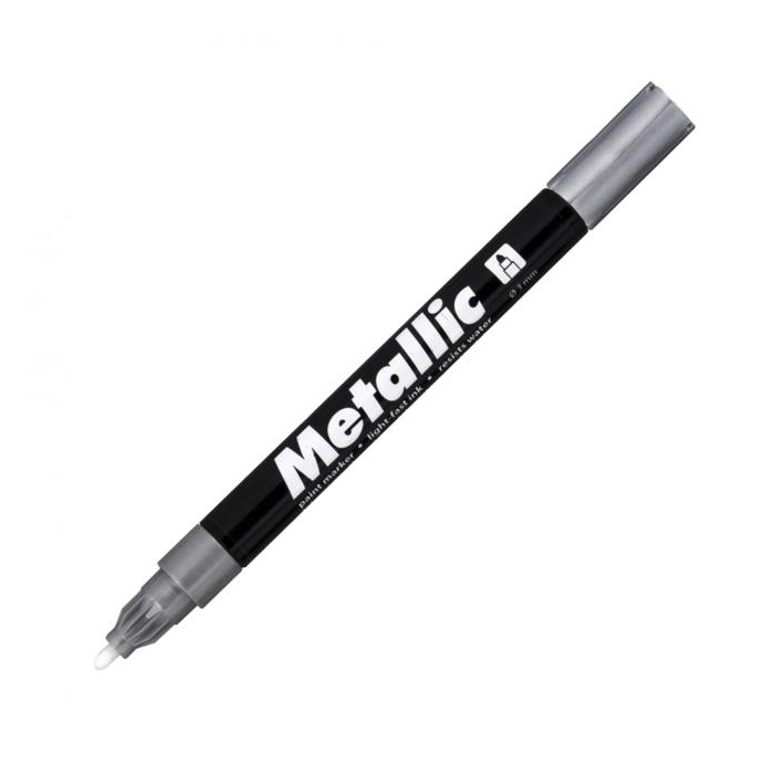 Lakový popisovač na neporézne povrchy. Svetlostály atrament po zaschnutí odolá vode, poveternostným vplyvom aj oderu. Hrot okrúhly, šírka stopy 1,5 mm. Väčšie balenie 10 ks v jednej farbe. Farba strieborná.
