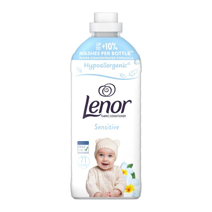 Hypoalergénna aviváž Lenor Sensitive poskytuje neutrálnu vôňu a nebeskú hebkosť. Zloženie je určené na citlivú pokožku, dermatologicky testované (test vykonaný na pokožke v kontakte s vypranou látkou) a certifikované Európskym centrom pre výskum alergií ECARF.